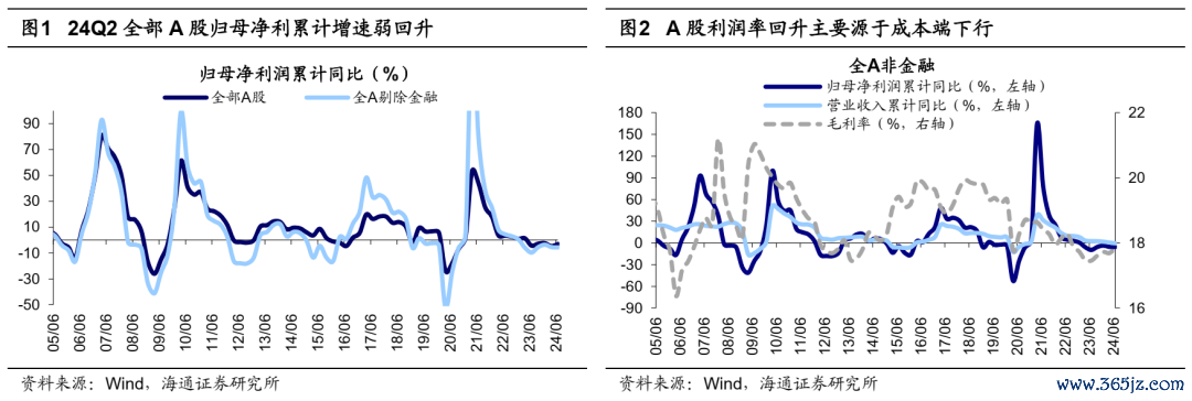 整体上看,24Q2全部A股盈利在低基数下实现弱回升。从累计同比角度看,24Q2全部A股归母净利累计同比增速在低基数下小幅回升至-3.2%,24Q1为-4.8%。剔除金融后,24Q2全部A股归母净利累计增速为-6.0%,24Q1为-5.5%。从单季同比角度看,全部A股同比增速改善更为明显,24Q2全A归母净利单季同比增速回升至-1.4%,24Q1为-4.8%,剔除金融后为-6.4%、-5.7%。